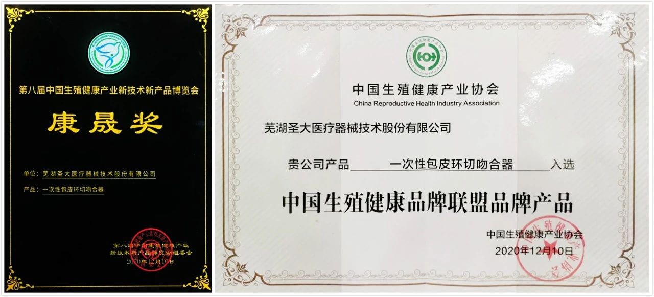 圣大醫療榮獲第八屆中國生殖健康產業新技術新產品博覽會“康晟獎”,公司主營產品一次性包皮環切吻合器入選“中國生殖健康品牌聯盟品牌產品”。全國第十一屆、第十二屆全國政協委員、國家衛生計生委原副主任、國家中醫藥管理局原局長王國強和第十二屆全國人大農業與農村委員會副主任委員、國家人口計生委原副主任、婦幼健康研究會會長江帆為圣大頒發獎牌和證書 。